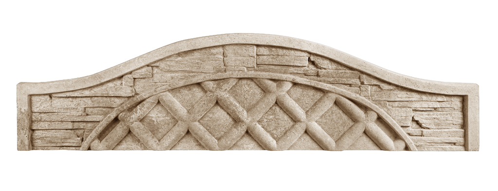 Tento betonový plot kombinuje robustnost betonu s dekorativním designem, který zaujme na první pohled. Jeho dominantní obloukový tvar a textura imitující kamenné zdivo dodávají oplocení výjimečný vzhled. Kosočtvercové ornamenty v centrální části pak vnášejí do designu zajímavý detail.